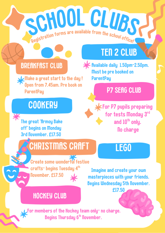 We also offer after-school provision each day. For KS1 we have Ten2 club which runs from 1.50 - 2.50 pm Monday to Friday. For our KS2 pupils we provide a wide range of clubs each term including American Football with the Causeway Giants, Make and Bake, Yoga, science, history, craft, sports and many, many more. We also offer multiple instrument tuition and residential stays among many other things. We listen to our pupils and meet their needs and interests.